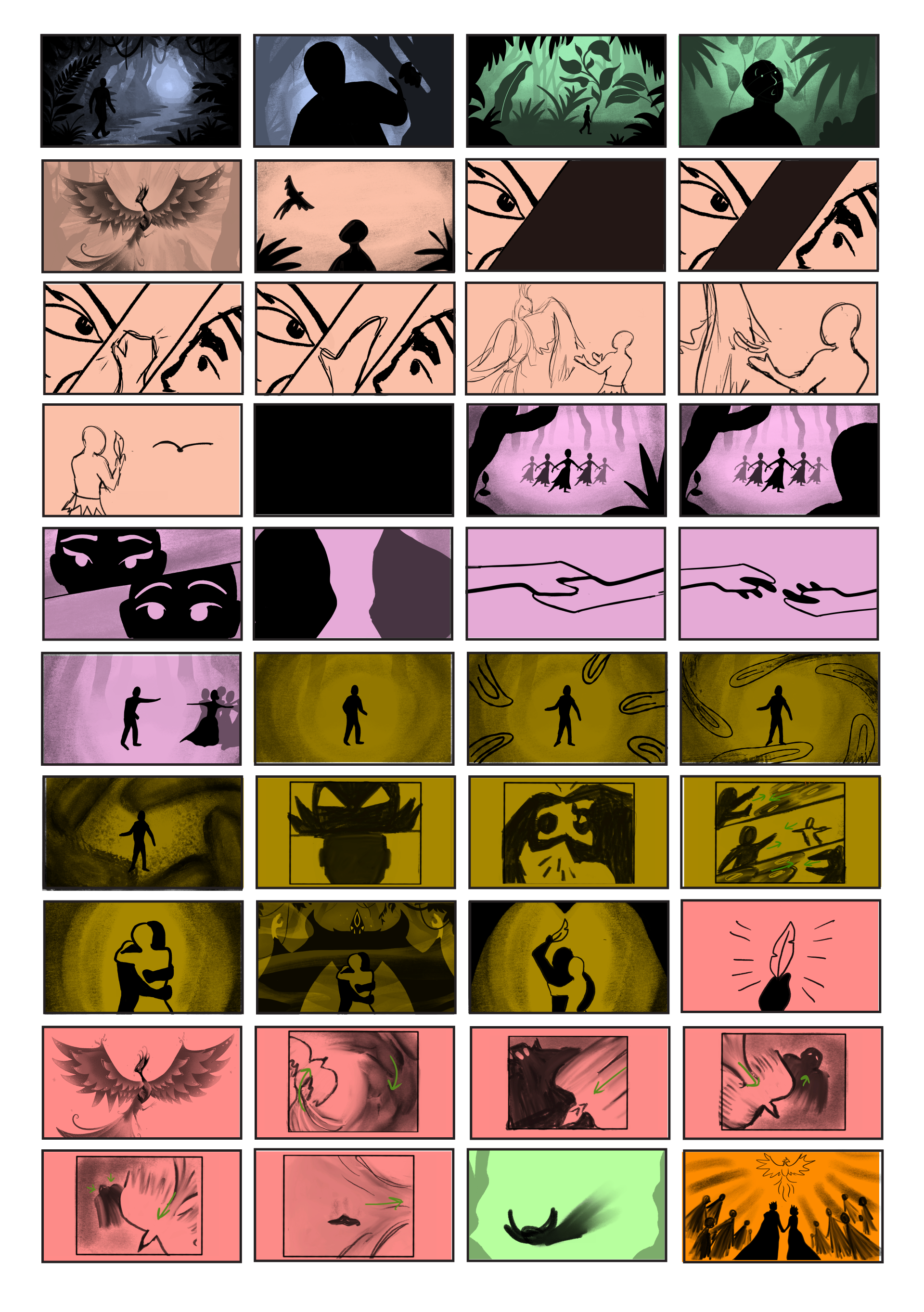The animation began with storyboarding the key moments of the narrative. These boards established the visual pacing of the story, translating the emotional beats of the ballet into a sequence of cinematic scenes. Each frame explored how movement, scale, and composition could echo the language of dance while guiding the viewer through the Prince’s journey and his encounters with the Firebird, the Princess, and the Sorcerer.